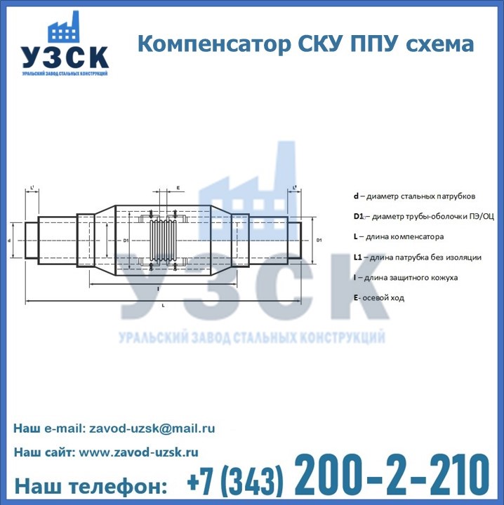 Уральский Завод Стальных Конструкций в Павлодаре предлагает готовые изделия, а также вы можете приобрести компенсатор СКУ ППУ под заказ. Наш завод располагает всем необходимым оборудованием для производства нестандартных позиций компенсатора СКУ в ППУ изоляции. Завод «УЗСК» предлагает большой выбор качественных и надежных компенсаторов СКУ ППУ, полностью укомплектованных и готовых к эксплуатации. Мы гарантируем соответствие нашей продукции всем требованиям ГОСТ и ТУ, износостойкость и высокую производительность. Наше предприятие поставляет и производит оборудование, имеющее длительную гарантию и большой эксплуатационный ресурс. Если вы хотите заказать сильфонные компенсационные устройства СКУ ППУ или другое оборудование с доставкой, наши специалисты помогут рассчитать стоимость транспортных расходов и организуют доставку товара. Вы можете оформить заказ на продукцию на нашем сайте, для этого достаточно заполнить форму обратной связи.
